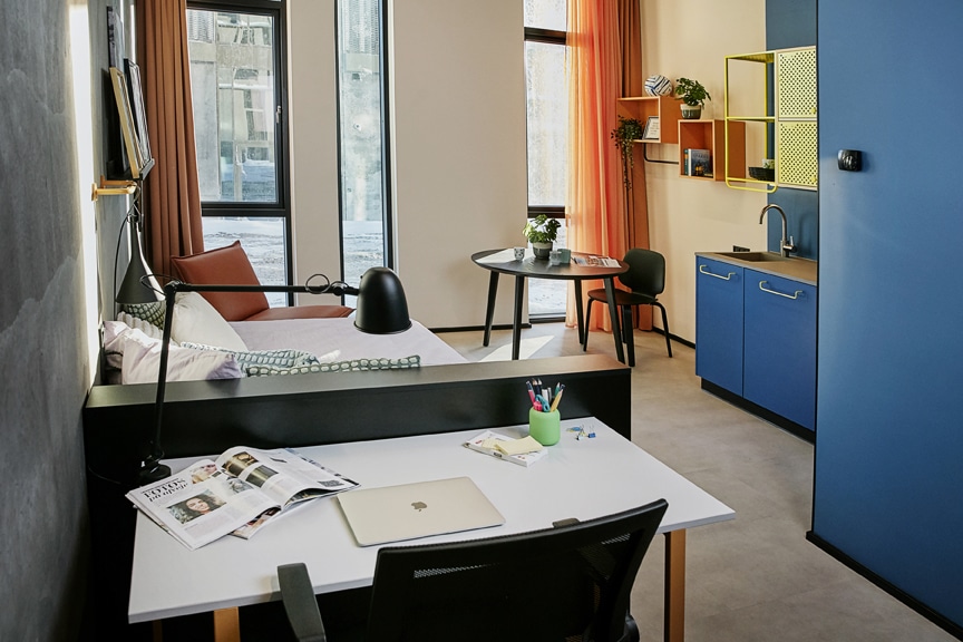 Disse lejligheder er udstyret med alt, hvad du behøver for at føle dig hjemme, herunder en 90×200 seng, en arbejdsplads, et klædeskab, et eget badeværelse og et privat køkken med køleskab, vask og kogeplader. Du har fuld adgang til alle vores fælles faciliteter, herunder et fælles køkken, et fitnesscenter, vaskeri, biograf, studie- og samarbejdsområder, chill-out-zoner og højhastigheds-WiFi overalt.