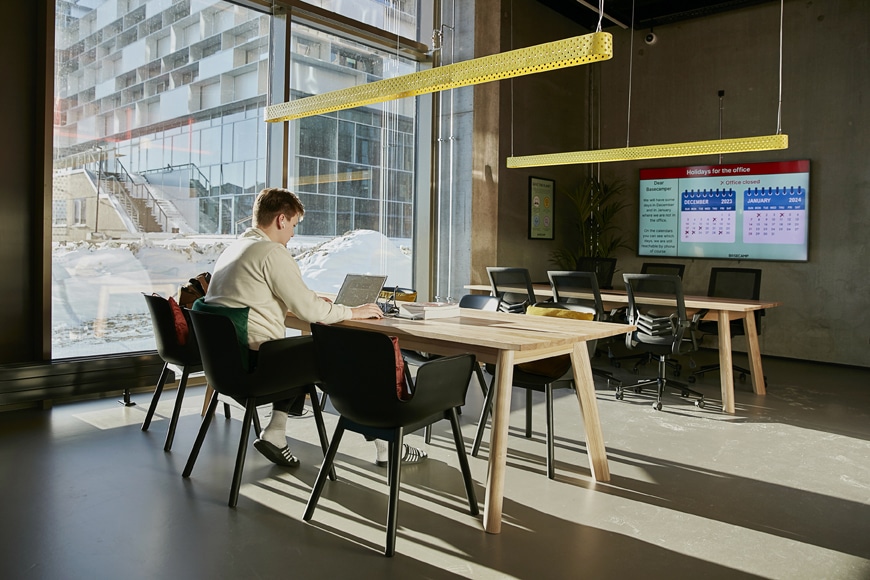 Students living at Basecamp Copenhagen student dormitory doing their homework in a meeting room