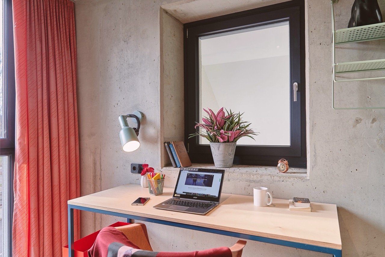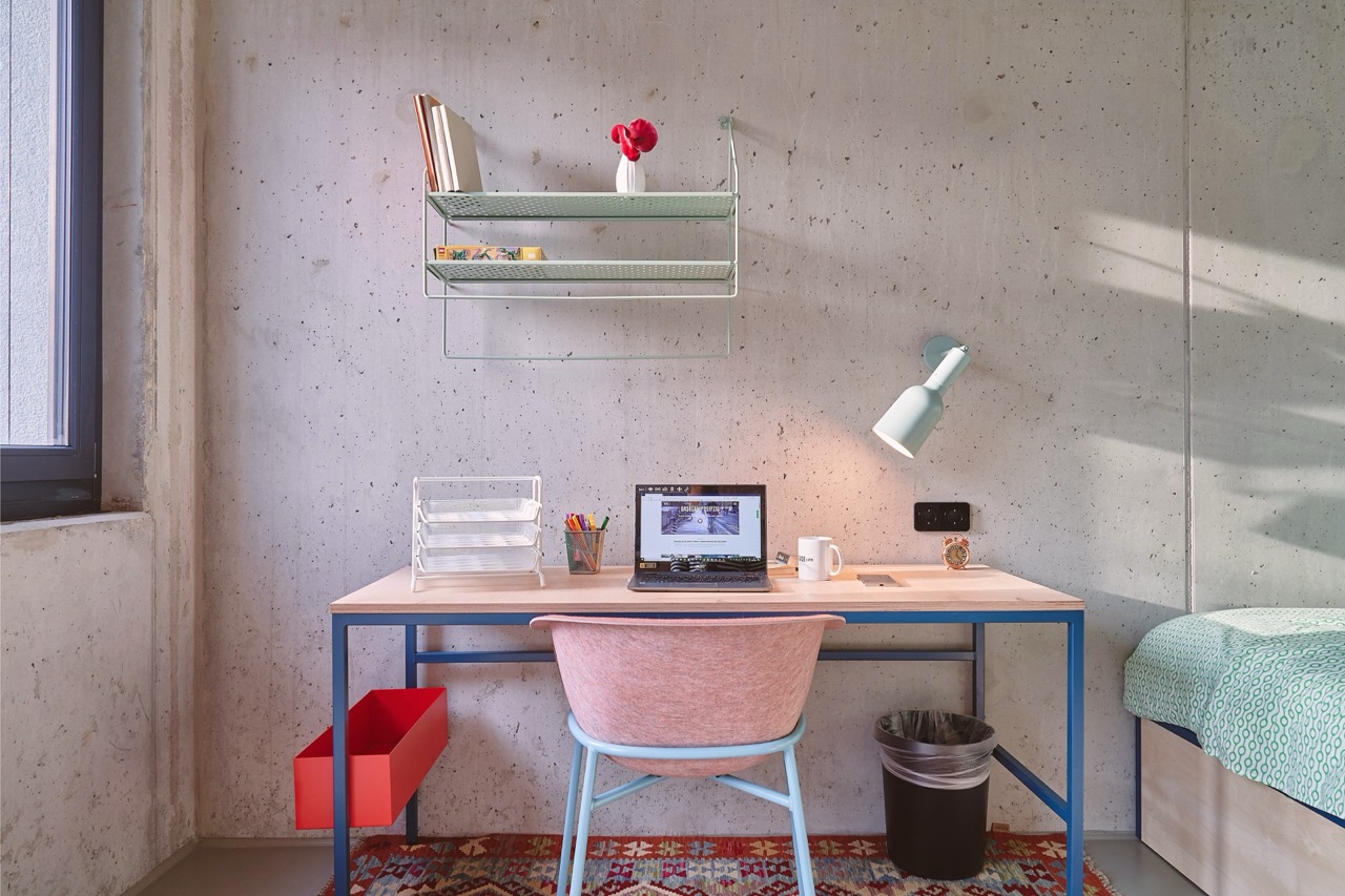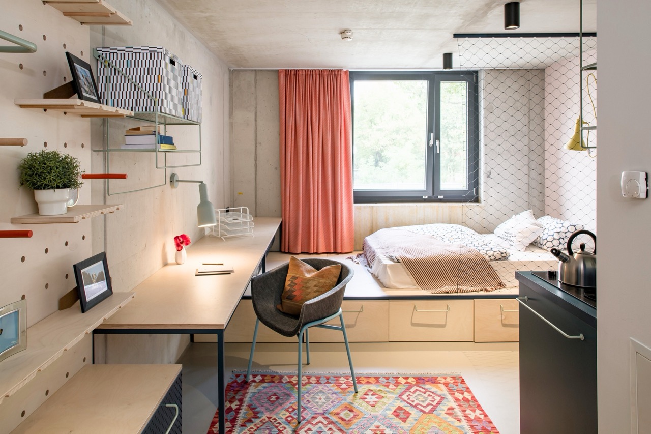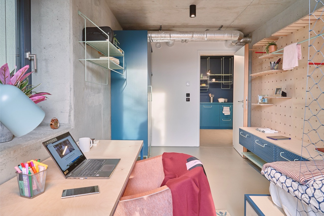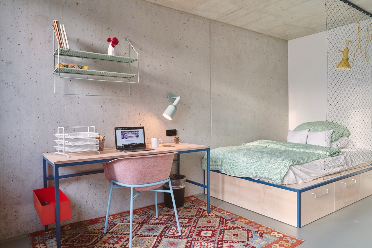These apartments are equipped with everything you need to feel at home, including a single bed, a workspace, plenty of storage and an ensuite bathroom. The rent includes all utilities such as electricity, heating and water. There are no separate bills or unpleasant surprises later on. You’ll have full access to all our shared facilities, including WIFI, kitchen, co-working spaces, gym, laundry, cinema, postboxes and chill-out zones.