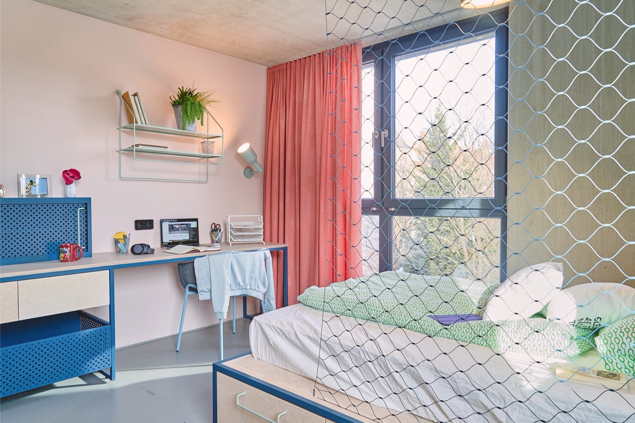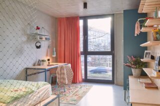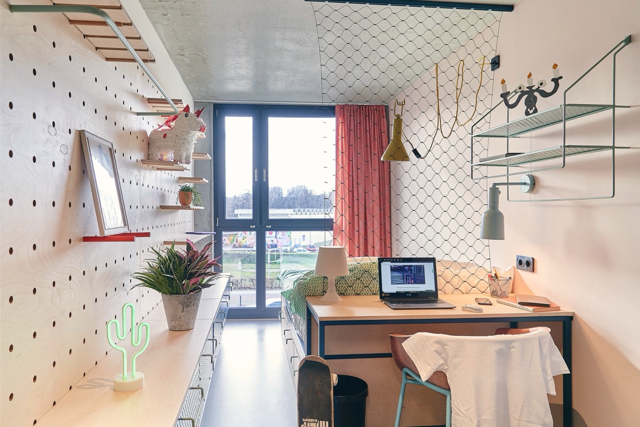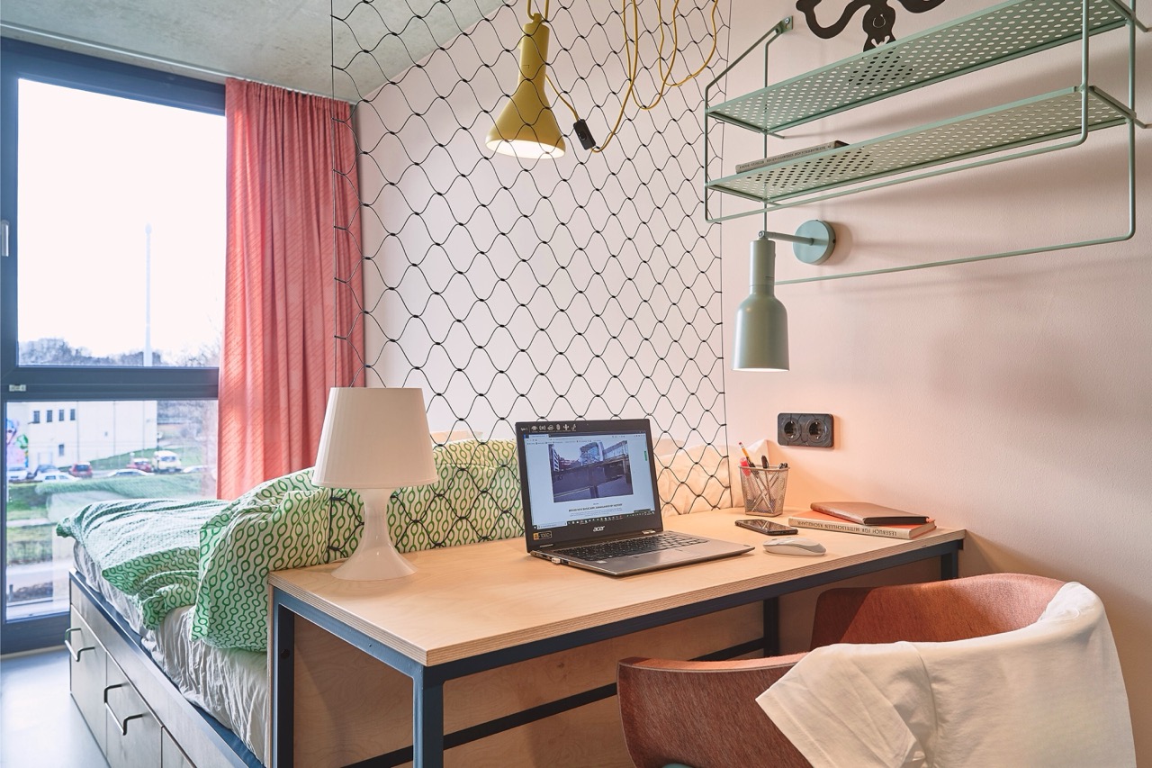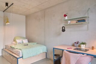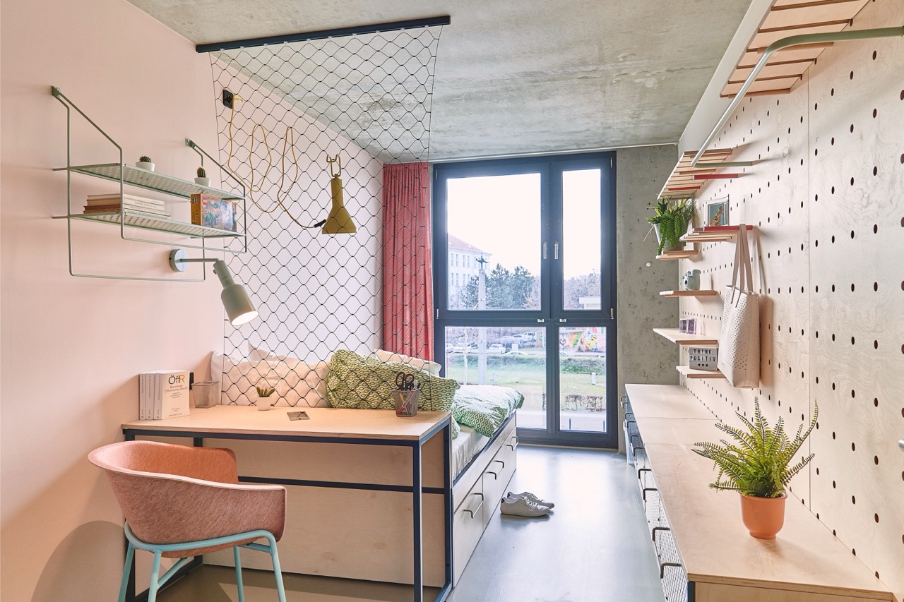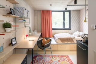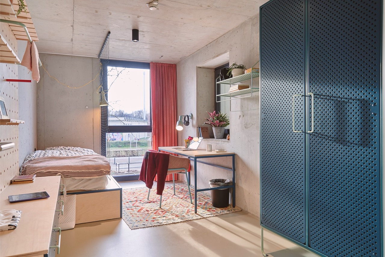 These apartments are equipped with everything you need to feel at home, including a single bed, a workspace, plenty of storage and an ensuite bathroom. The rent includes all utilities such as electricity, heating and water. There are no separate bills or unpleasant surprises later on. You’ll have full access to all our shared facilities, including WIFI, kitchen, co-working spaces, gym, laundry, cinema, postboxes and chill-out zones.