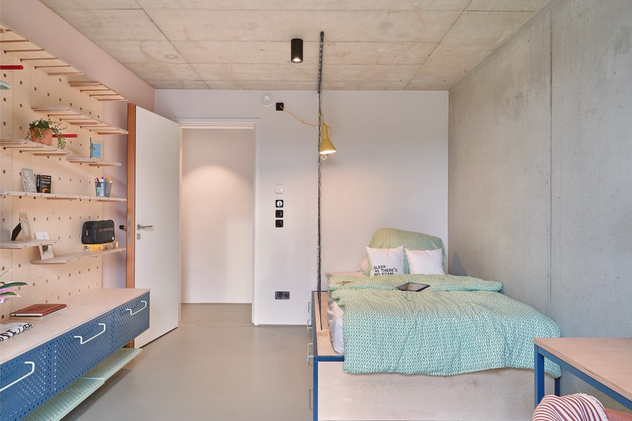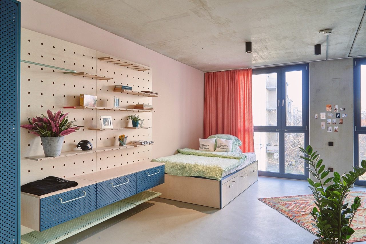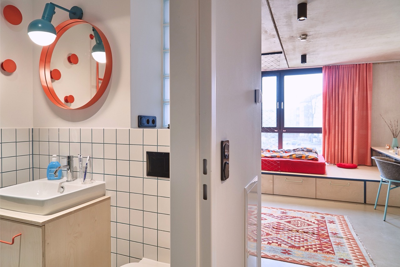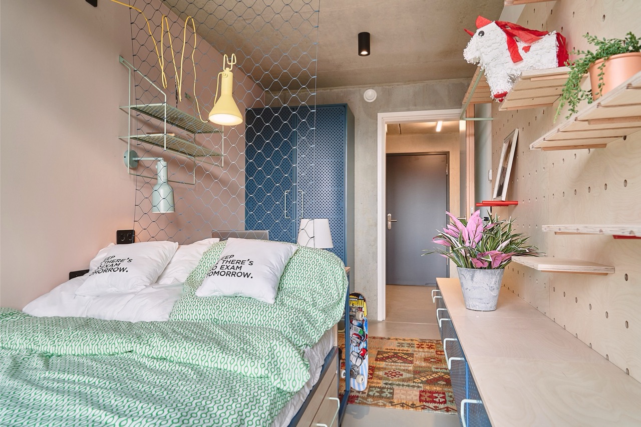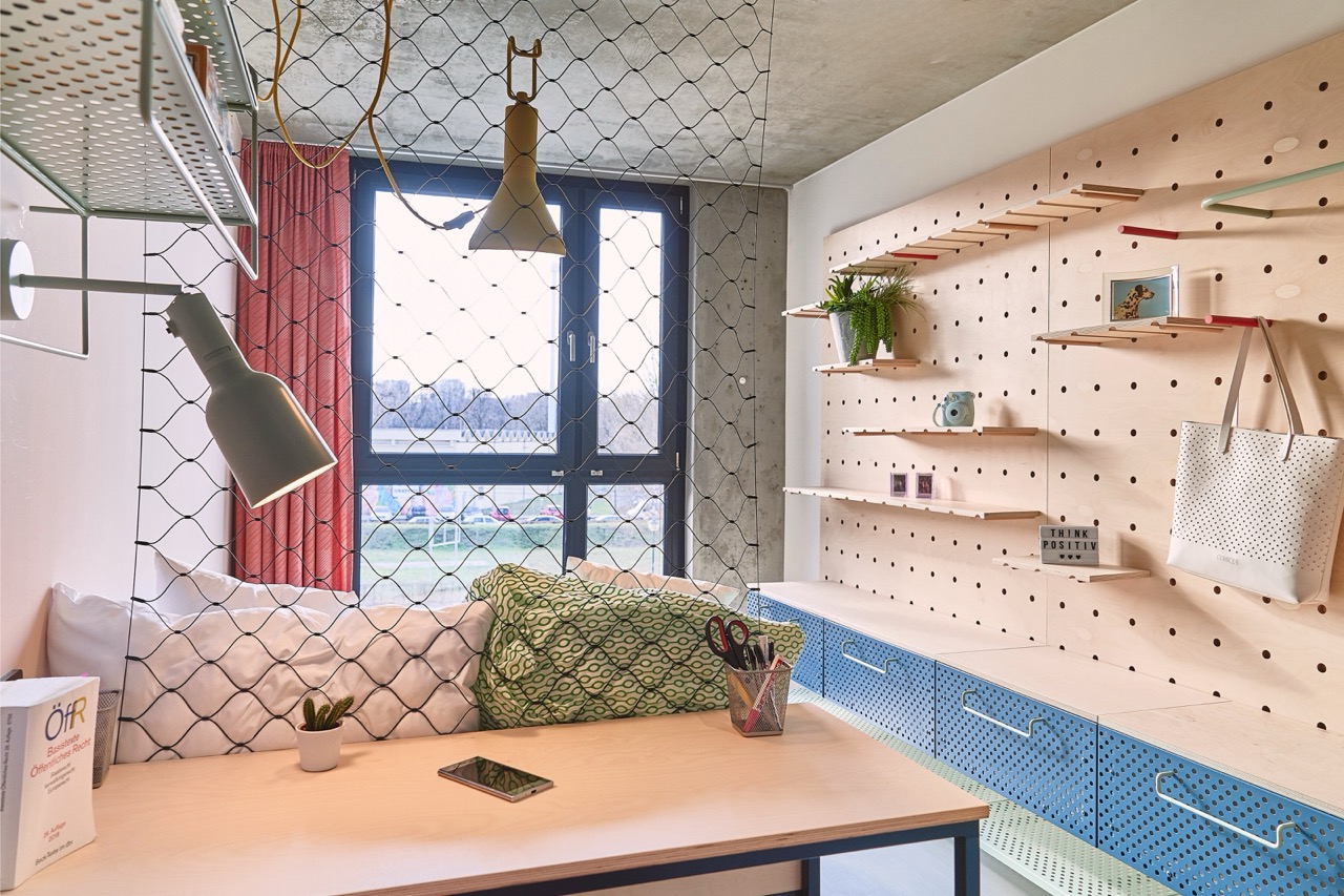 These apartments are equipped with everything you need to feel at home, including a single bed, a workspace, plenty of storage and an ensuite bathroom. The rent includes all utilities such as electricity, heating and water. There are no separate bills or unpleasant surprises later on. You’ll have full access to all our shared facilities, including WIFI, kitchen, co-working spaces, gym, laundry, cinema, postboxes and chill-out zones.