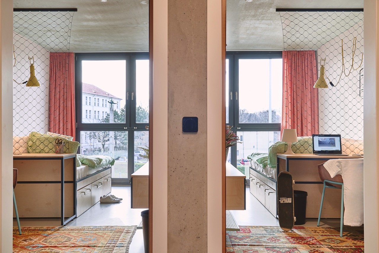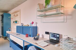 These shared apartments are equipped with everything you need to feel at home, including two private bedrooms, workspaces, plenty of storage, an ensuite bathroom and kitchen equipped with a fridge, sink and hob. The rent includes all utilities such as electricity, heating and water. There are no separate bills or unpleasant surprises later on. You’ll have full access to all our shared facilities, including WIFI, co-working spaces, gym, laundry, cinema, postboxes and chill-out zones.