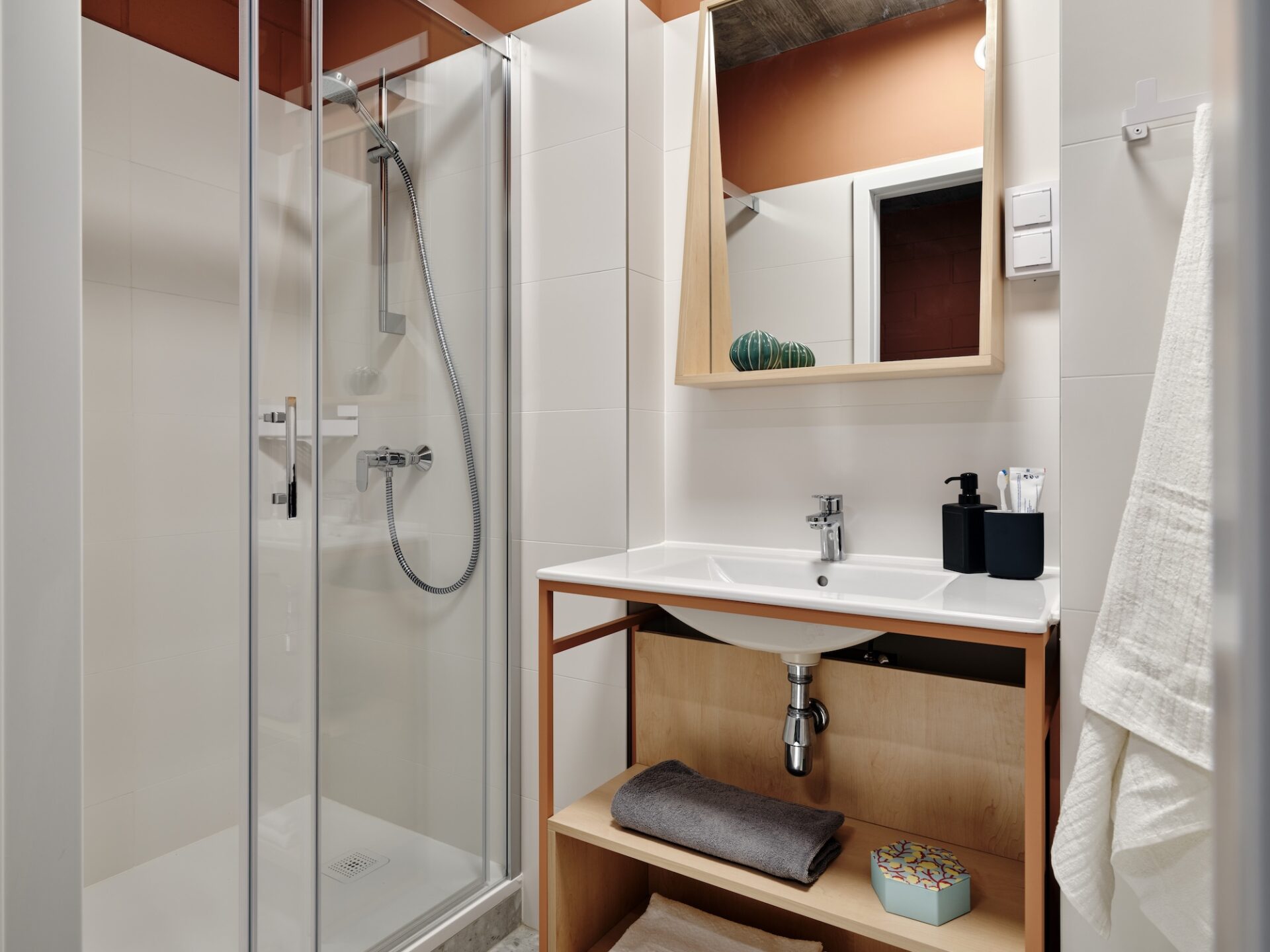 These rooms are equipped with everything you need to feel at home. Located in a separate building B connected by an internal connector with access to all amenities. They have a 120 cm bed, a work area, plenty of storage space, a bathroom and a kitchen equipped with a fridge, microwave, sink and hob.