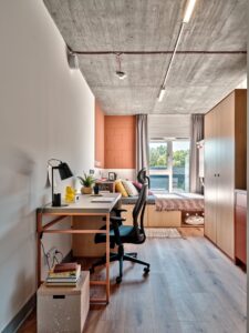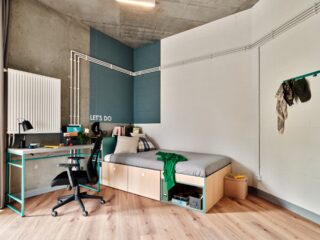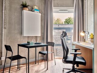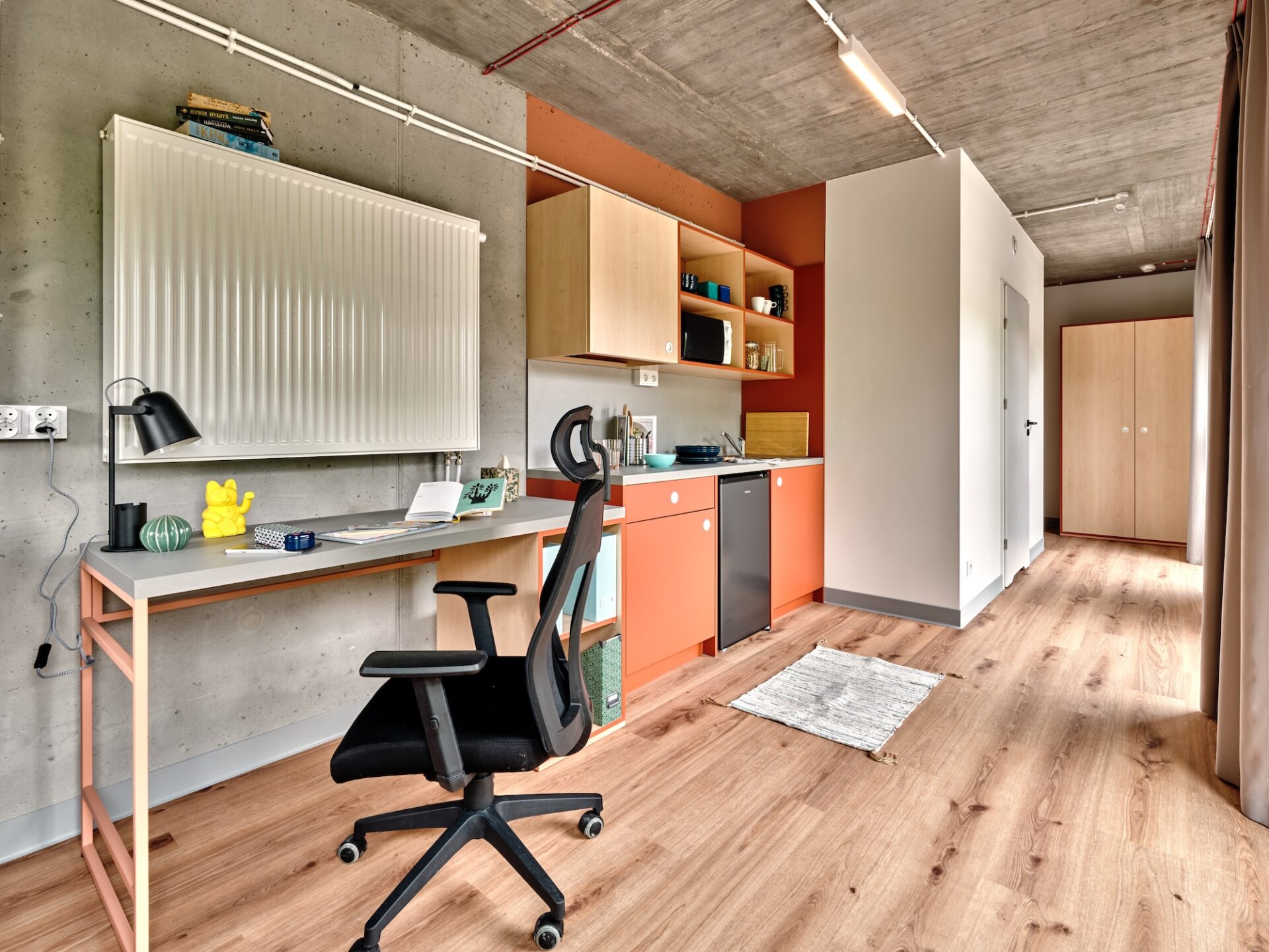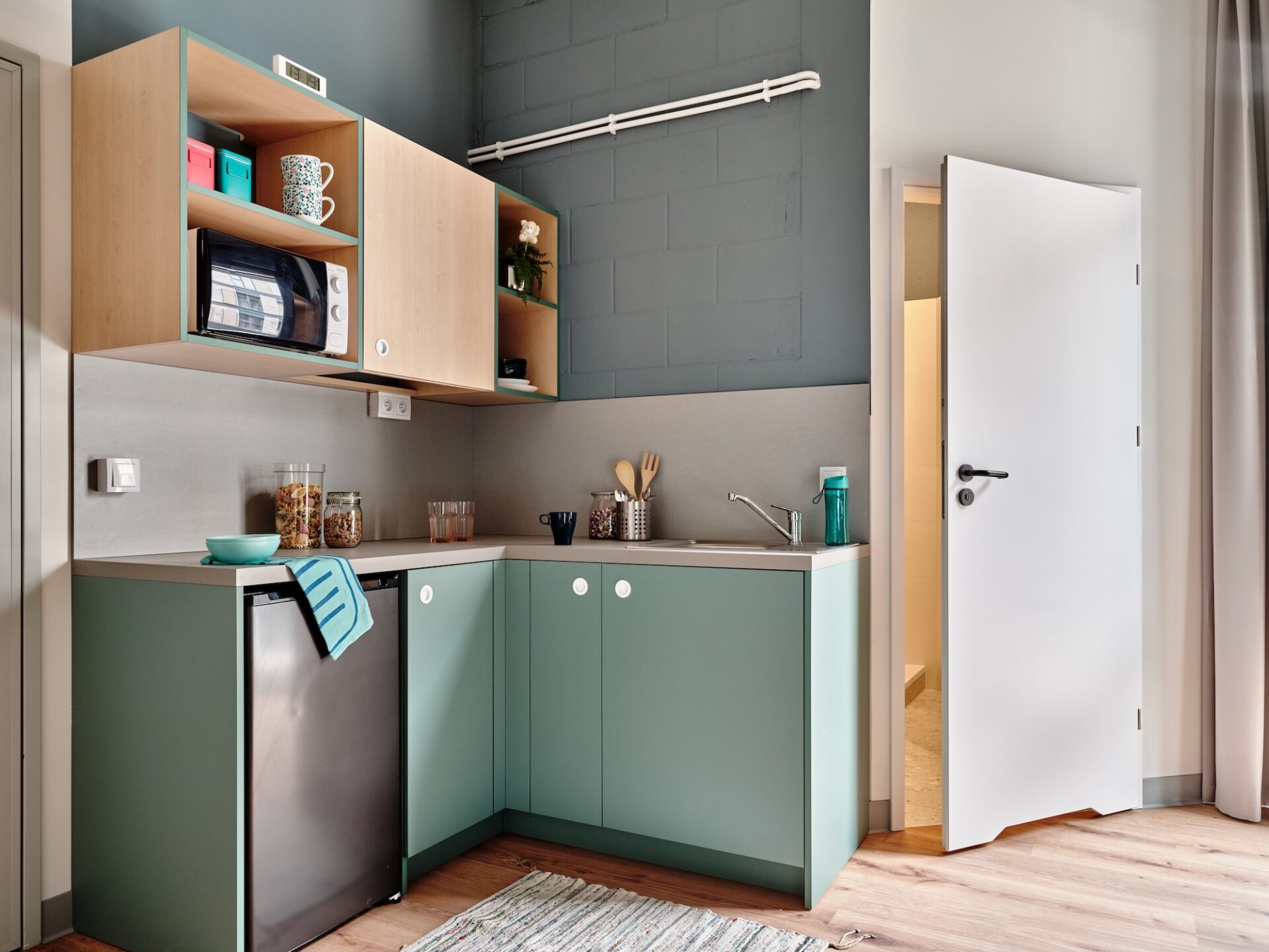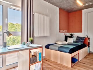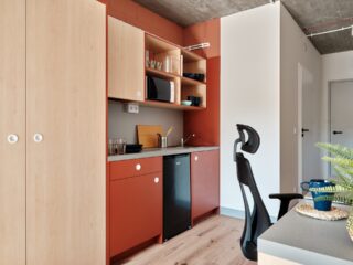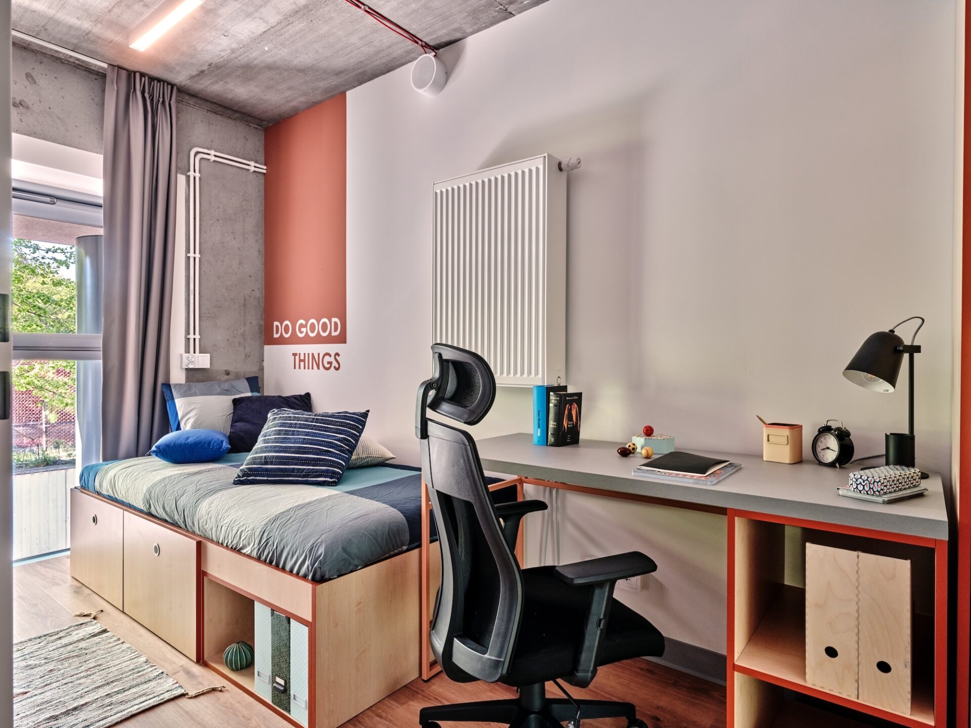 These apartments in our student housing in Warsaw are equipped with everything you need to feel at home, including a 120cm bed, a workspace, plenty of storage, an ensuite bathroom and kitchen equipped with a fridge, microwave, sink and hob.