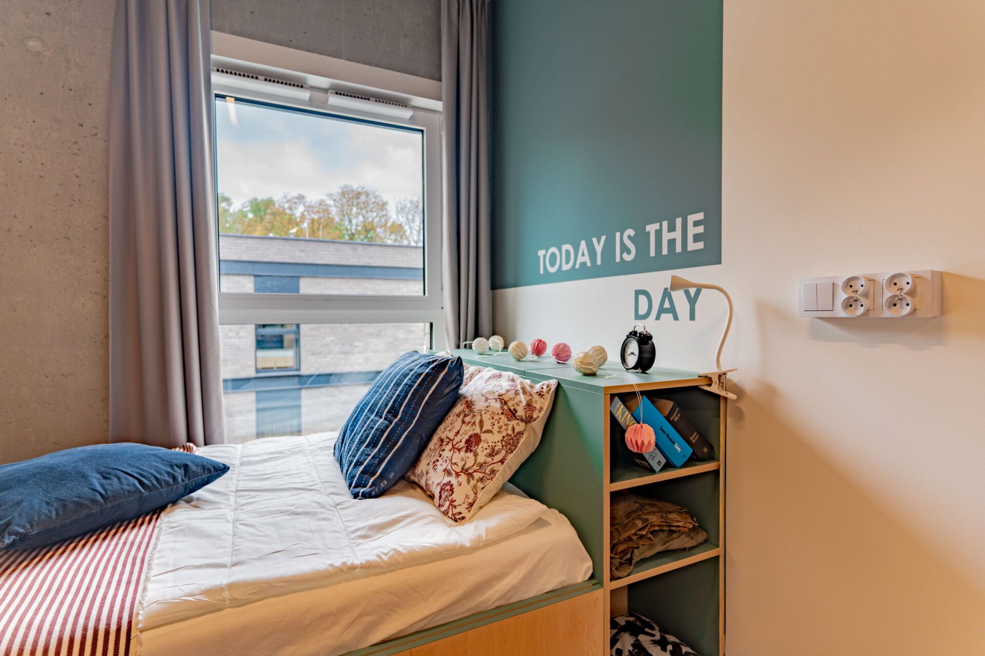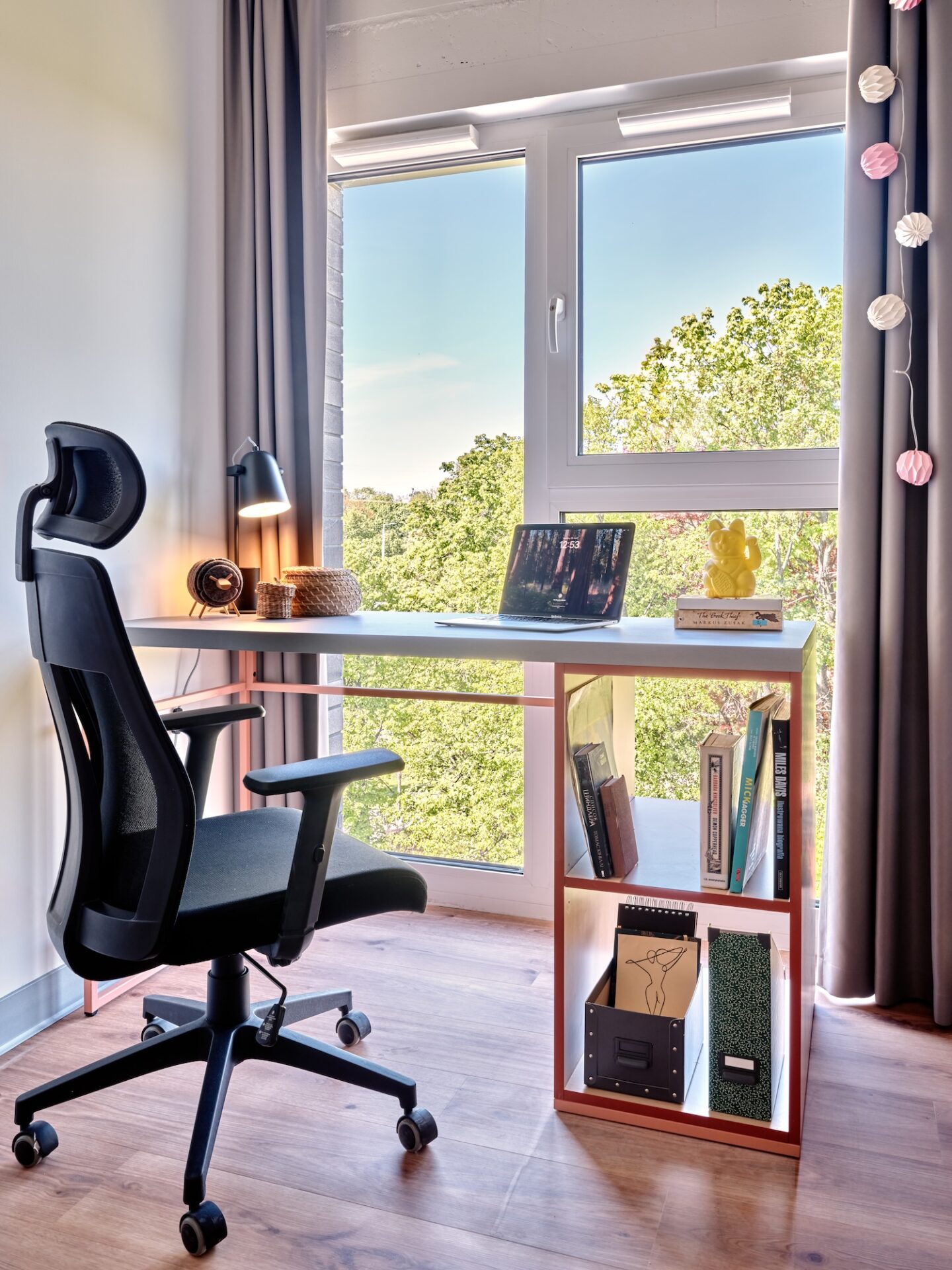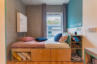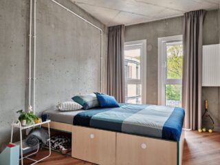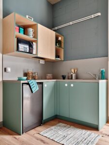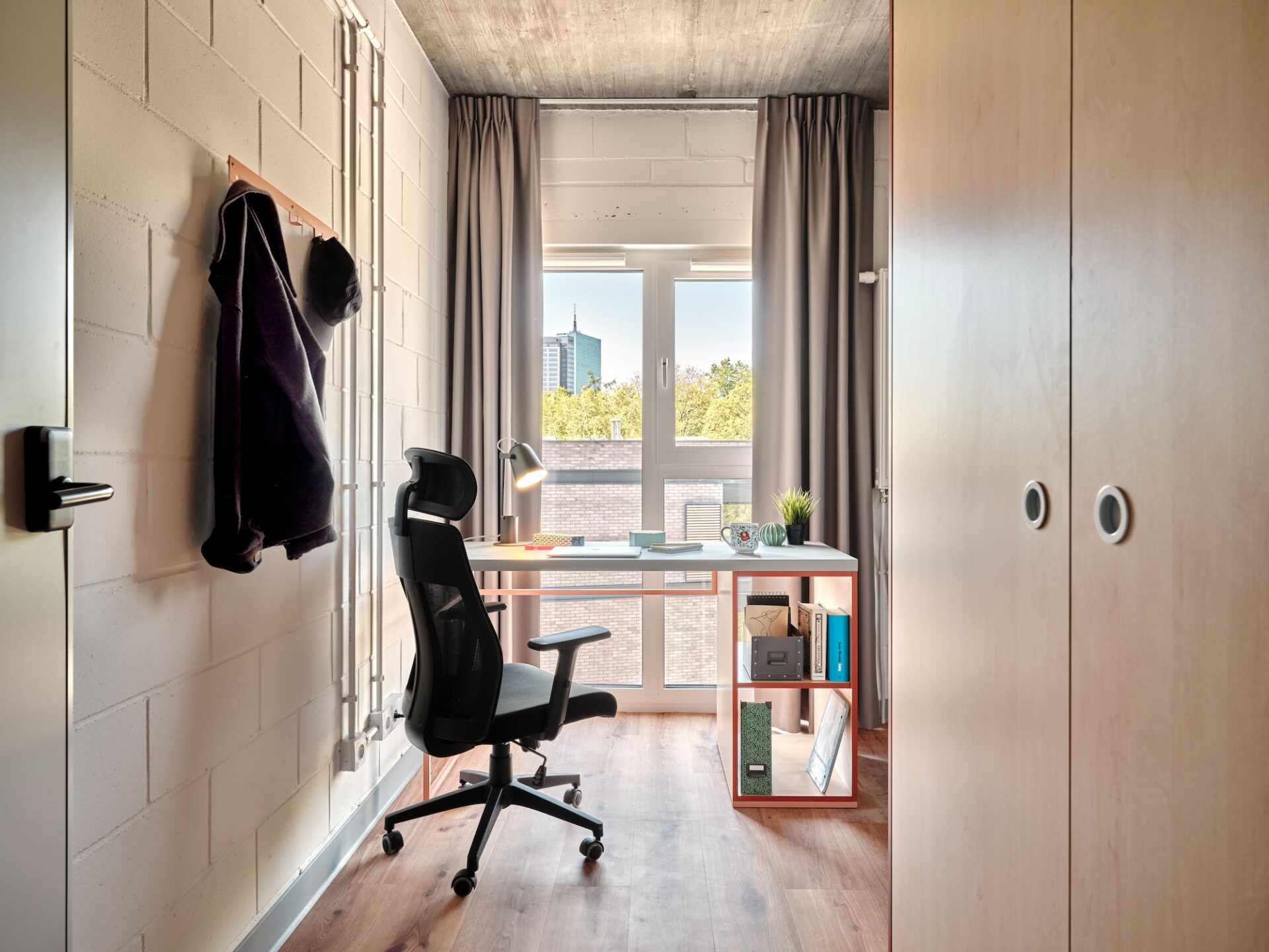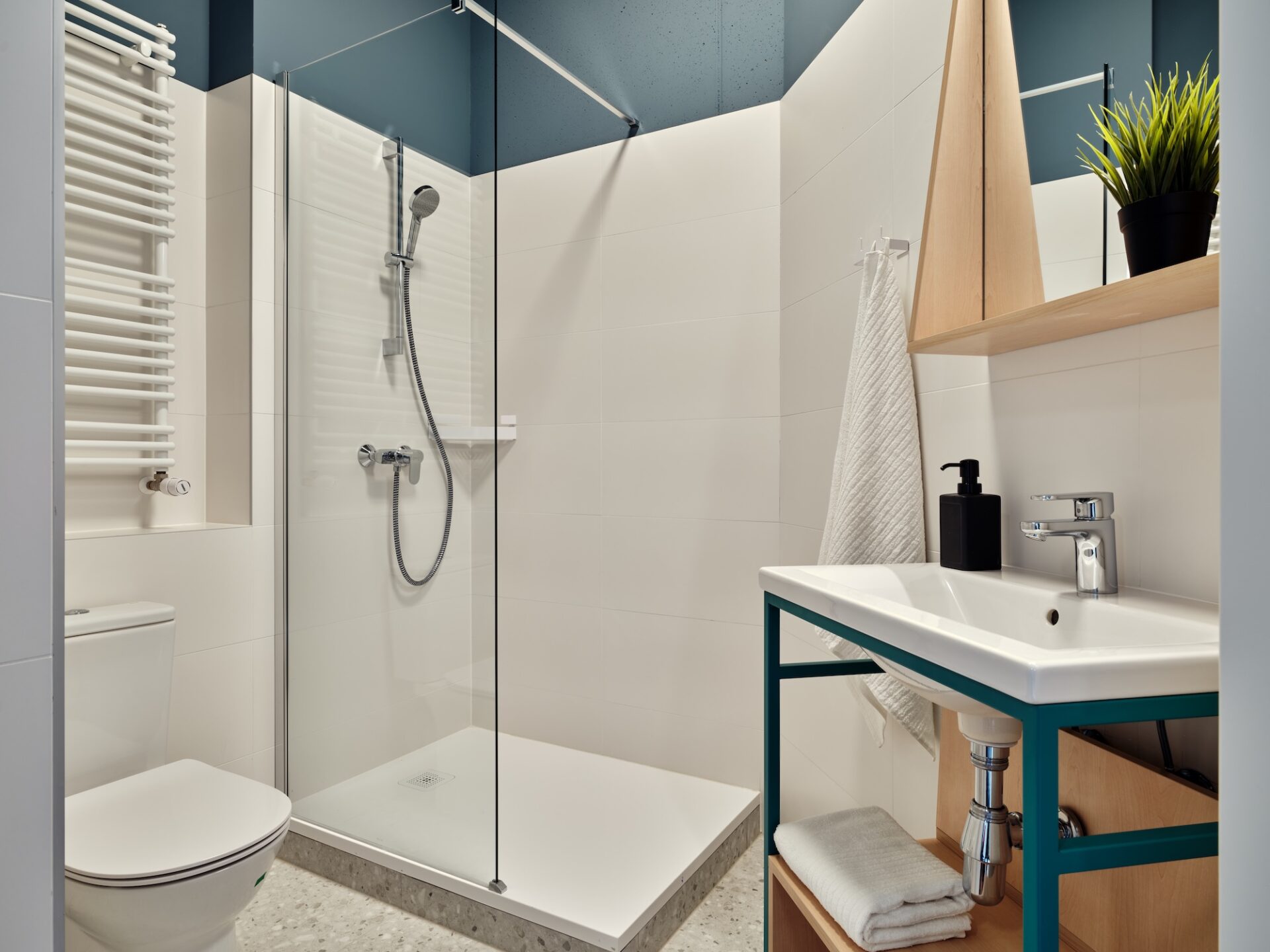 These apartments in our student housing in Warsaw are equipped with everything you need to feel at home, including a 120cm bed, a workspace, plenty of storage, an ensuite bathroom and kitchen equipped with a fridge, microwave, sink and hob.