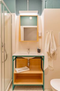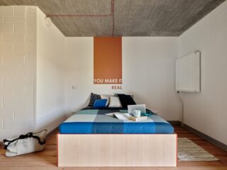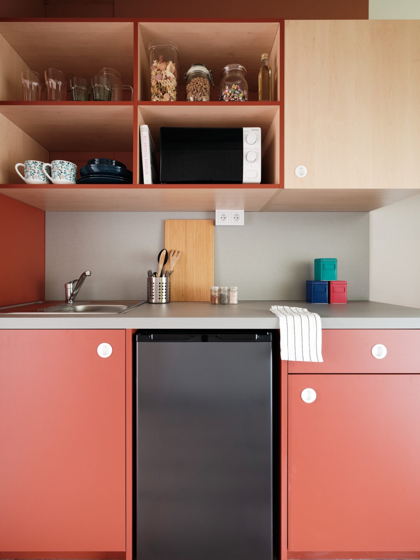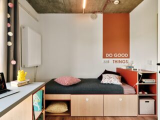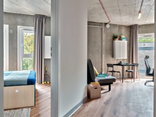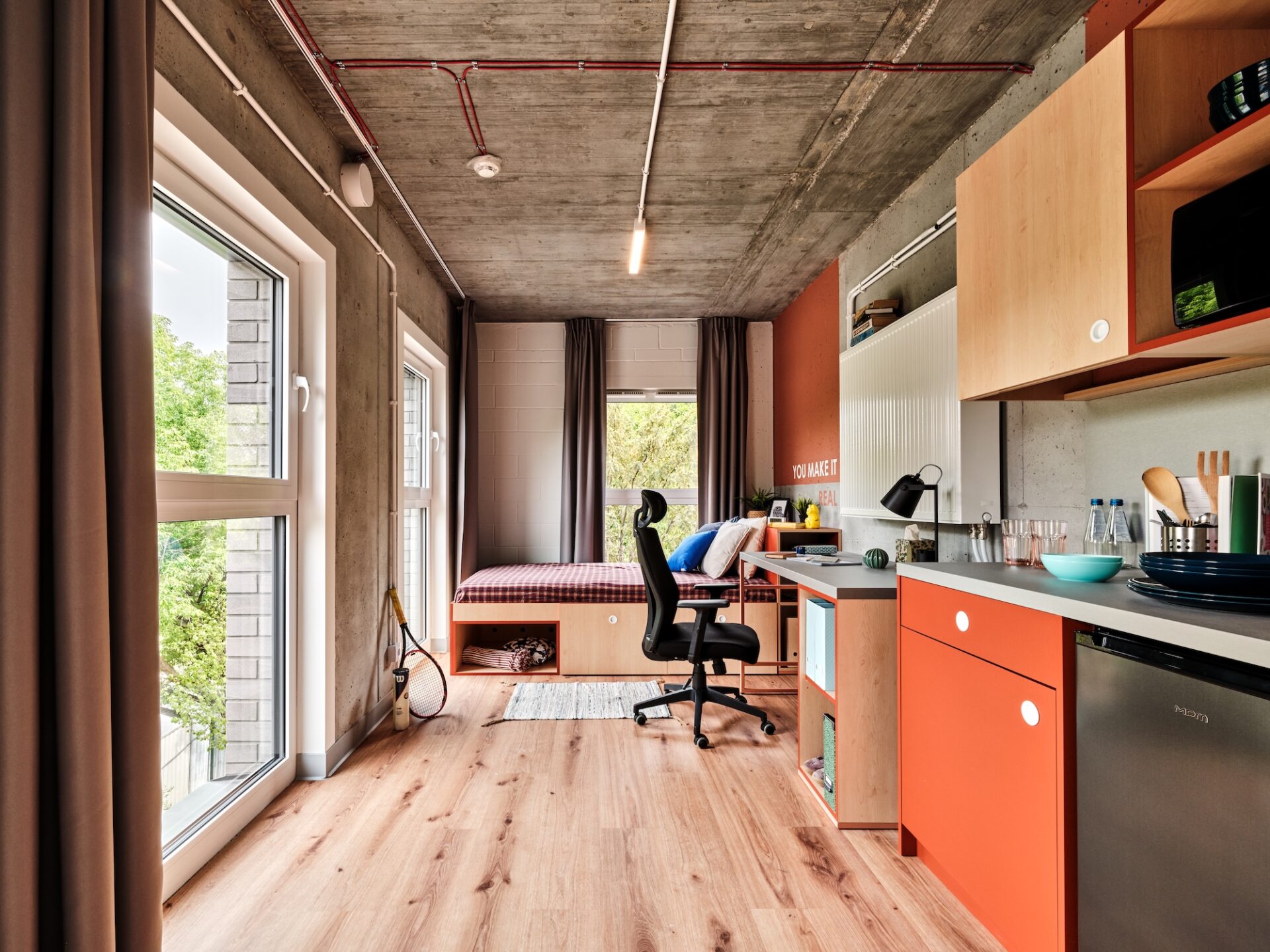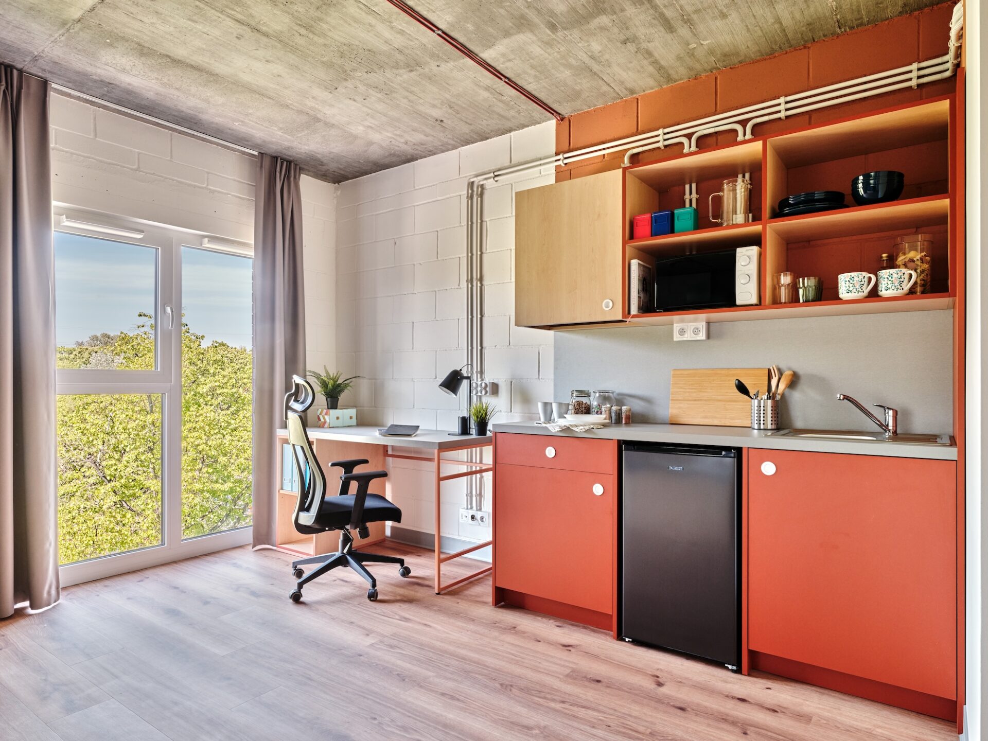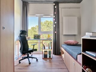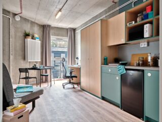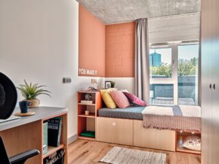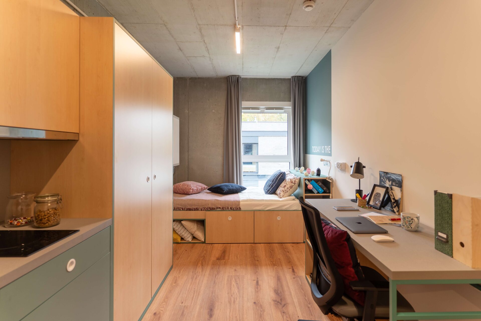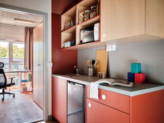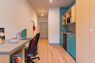 These apartments are the largest of our single rooms and are equipped with everything you need to feel at home, including a 120cm bed, a workspace, plenty of storage, an ensuite bathroom and kitchen equipped with a fridge, microwave, sink and hob.